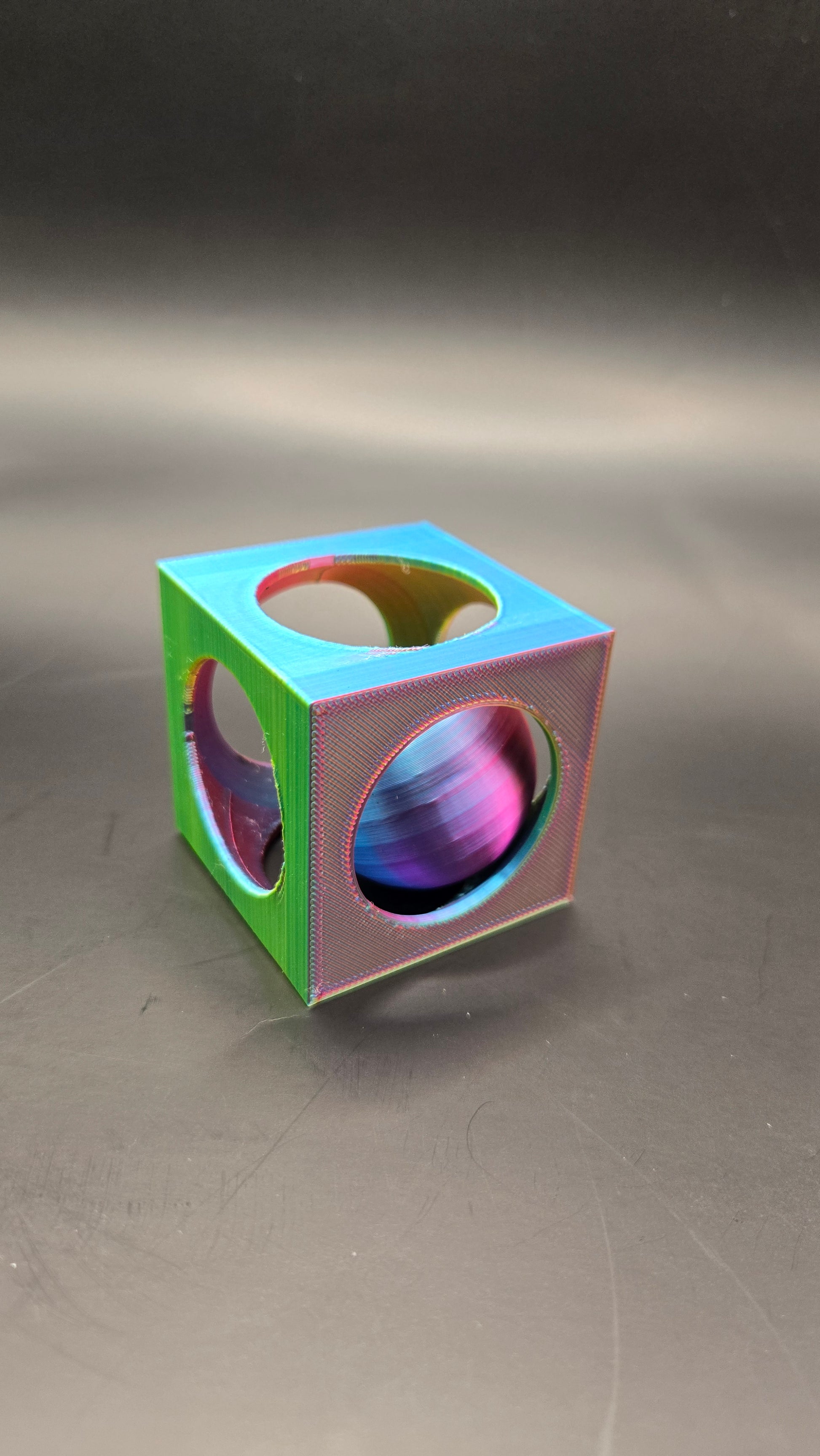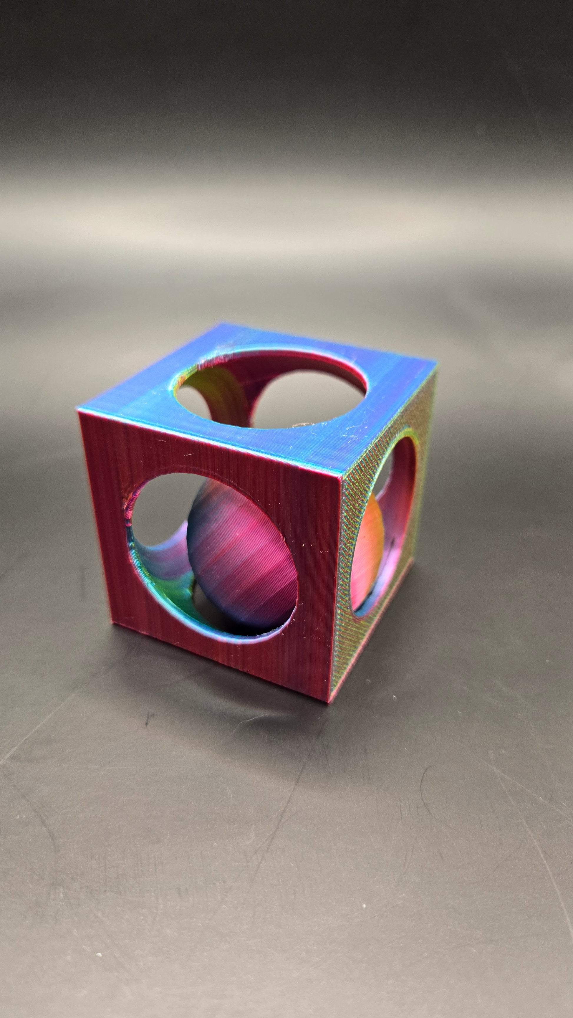 3d printed; fidget toy; ball in cube; relaxing; for stress and anxiety; just for fun; blue, yellow, fuchsia mix - color will vary due to nature of the manufacturing