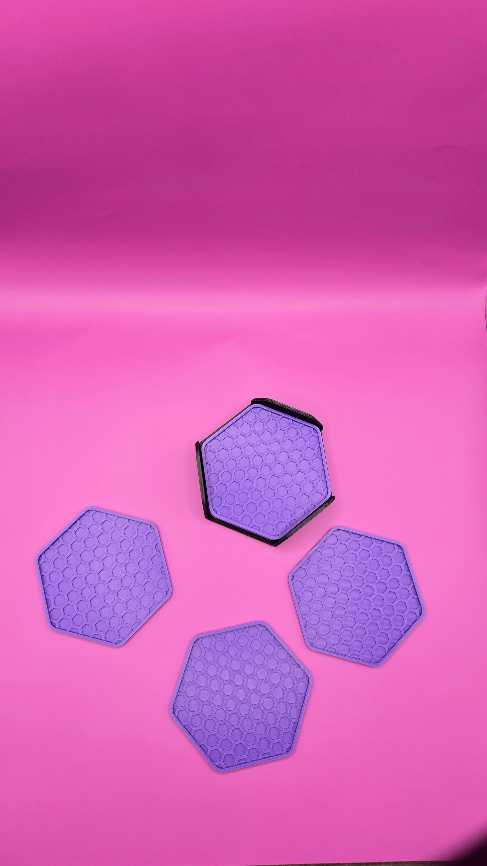 3d printed; hex shape coasters with stand; home décor; coaster set; black and purple