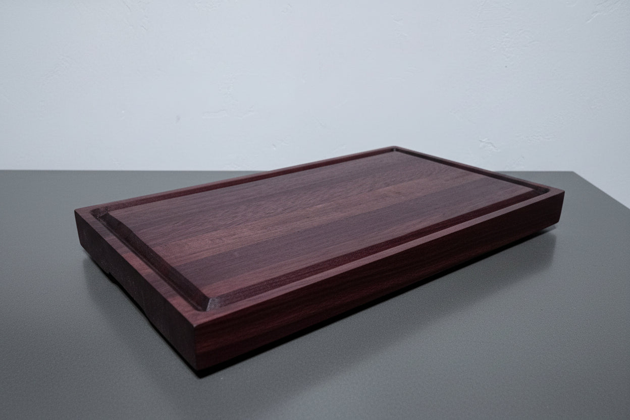 Handcrafted from exotic purple heart wood, this large cutting board combines rustic charm with thoughtful functionality. Measuring 18" × 11¼" × 2", it offers ample workspace for meal prep and entertaining. A routed juice groove contains liquids, while ergonomic routed handles ensure comfortable carrying. Rubber feet keep the board stable and protect your countertop. Built to last, this artisan piece brings warmth and character to any kitchen. Shipping included.