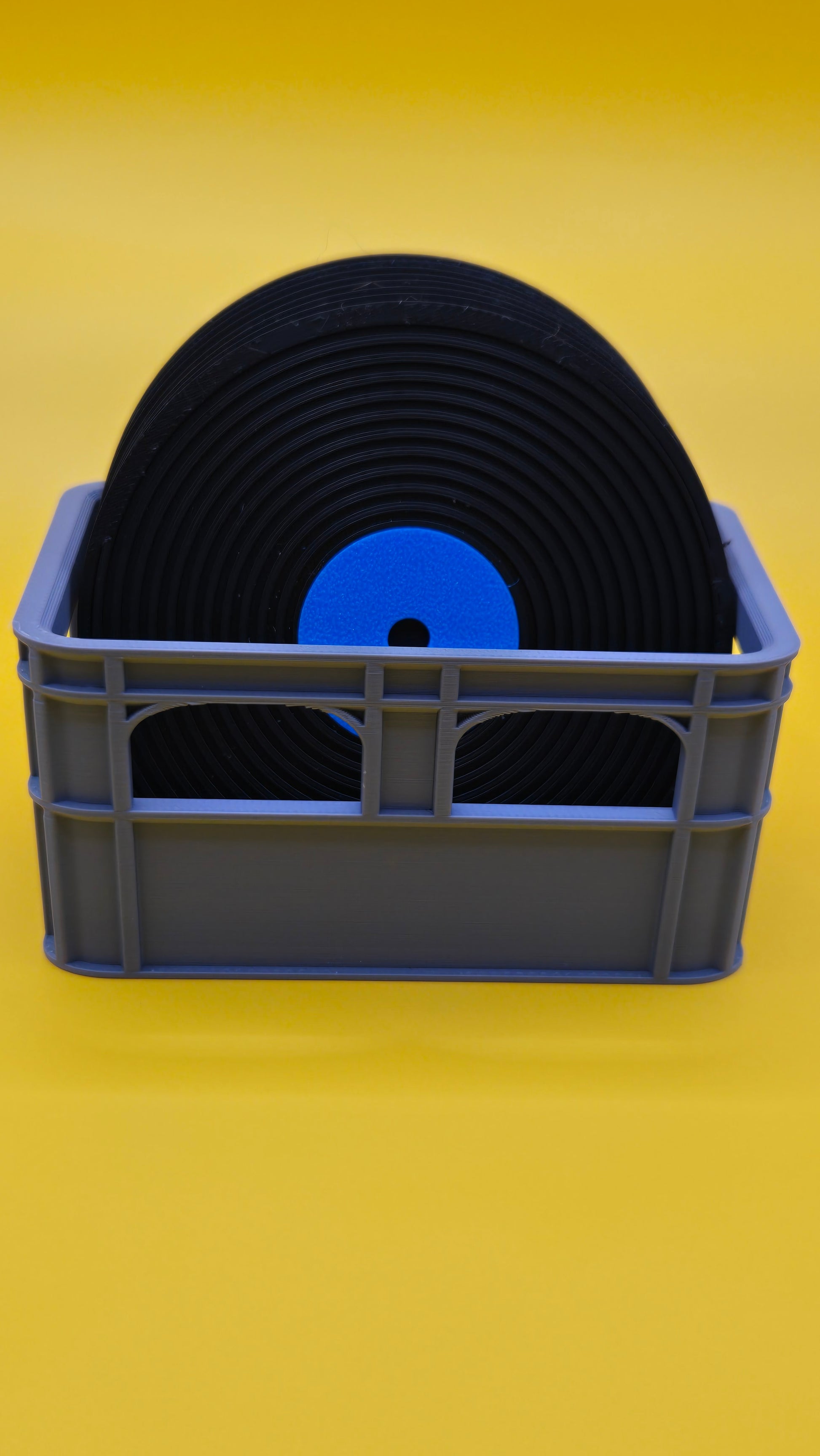 3d printed; records coaster set with crate; home décor; base=black, centers=blue, crate=grey